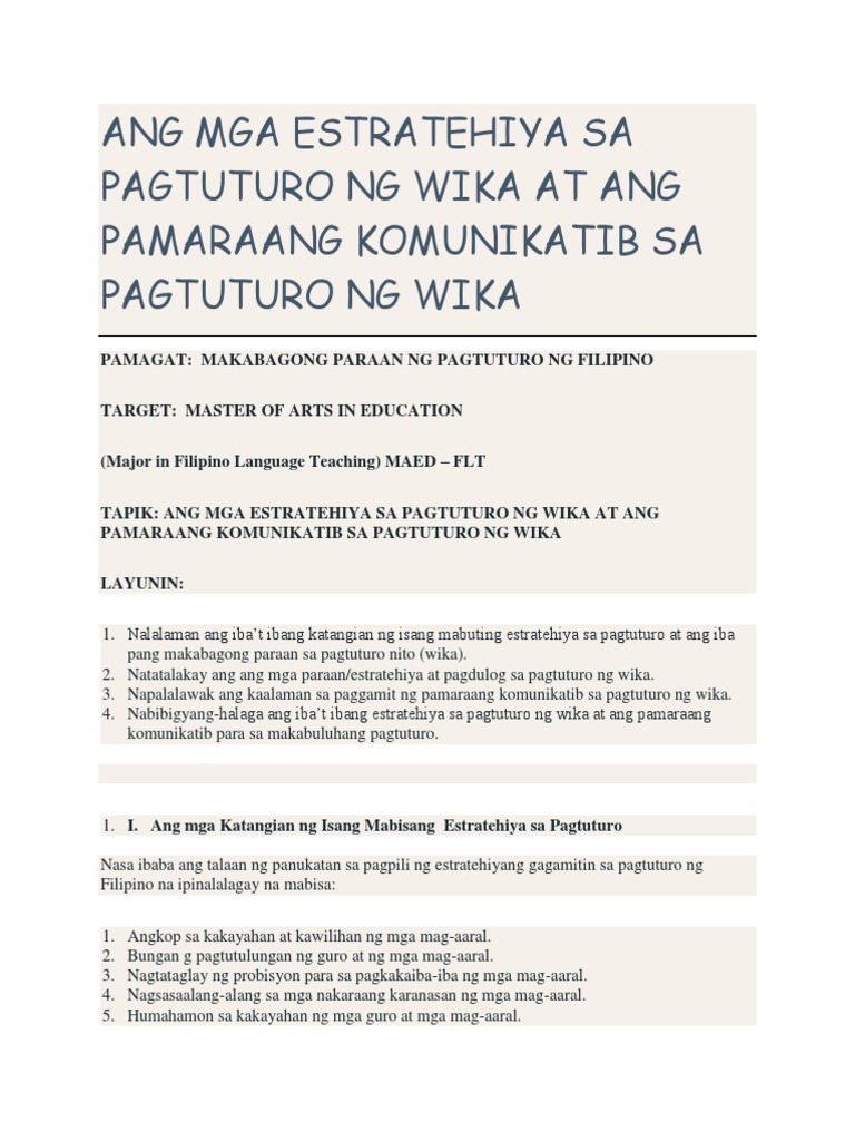 Doc Pamagat Makabagong Paraan Ng Pagtuturo Ng Filipino Target Master Of Arts In Education Major In Filipino Language Teaching Maed Flt Tapik Ang Mga Estratehiya Sa Pagtuturo Ng Wika At Ang