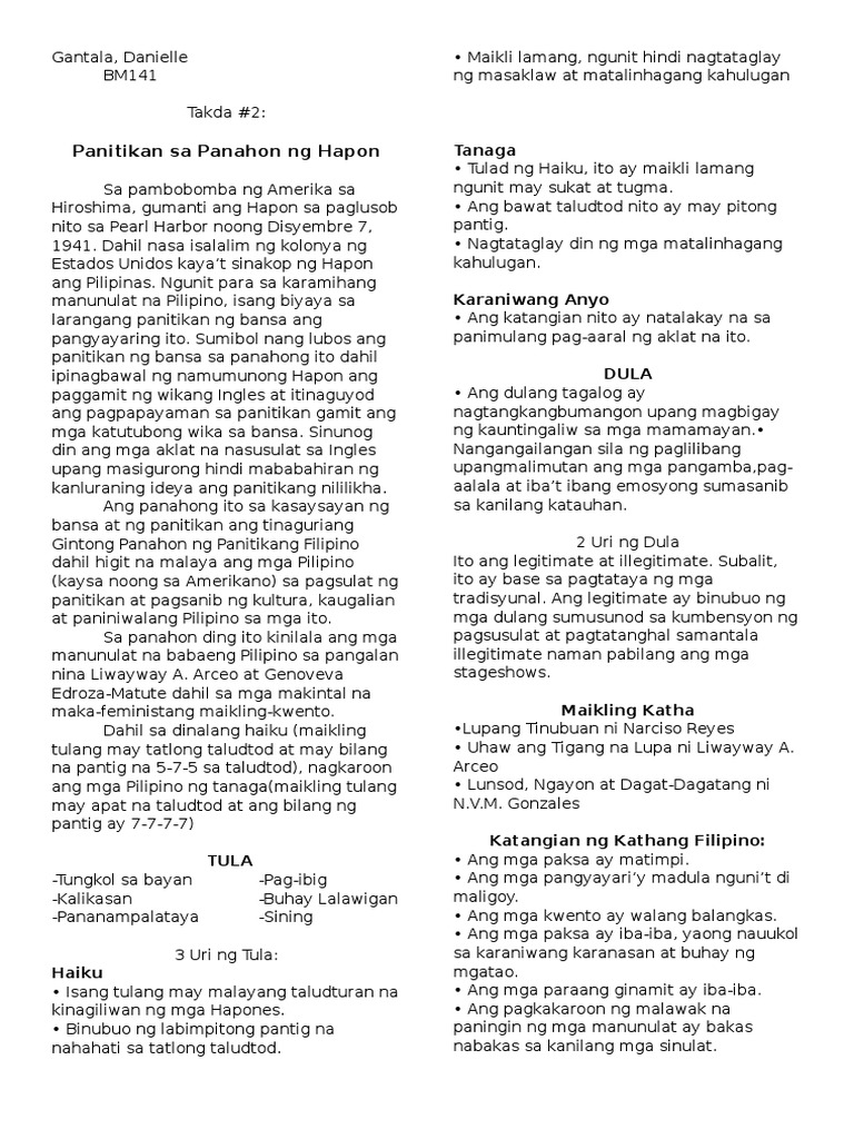 Panitikan sa Panahon ng mga Hapon by Gideon Banzuela January 5th 2021 - Nagkaroon ng krisis sa mga papel noong panahon ng mga Hapon kaya kaunti lamang ang mga nagawang mga nobela May apat na naging sikat na nobela noong panahon ng mga Hapon katulad ng a Sa Pula Sa Puti ni Francisco Soc Rodrigo b Tatlong Maria ni Jose Esperanza Cruz c Sa Lundo. Answerpina hirapan sila ng mga hapun ng dahil sa kalupitan ng mga hapun maraming namatay sa mga pilipino. Ibabaw ng mga base militar ng mga kano ay natiyak sa dalawang okasyon noong 1970 sa pananakop ng mga amerikano panitikan sa panahon ng hapon 1 h m 1 umg m m.
