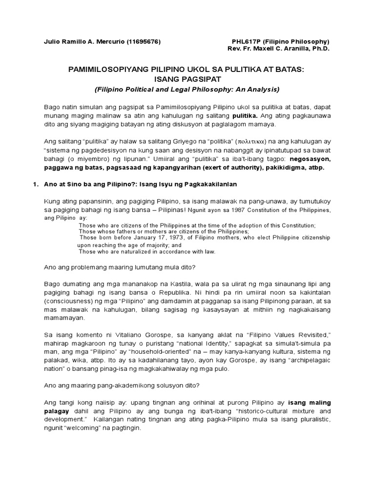 Pamimilosopiyang Pilipino Ukol Sa Pulitika At Batas Isang Pagsipat