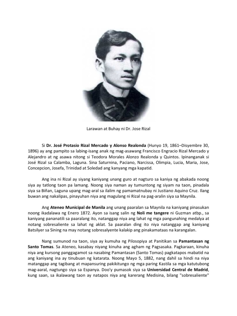 Sinabi ni Rizal na si Padre Francisco de Paula Sanchez ay isang modelo ng katuwiran at pagsisikap para sa pag-unlad ng kaniyang mga mag-aaral. Makabayan si Rizal sapagkat ginawa niya ang lahat para maging Malaya an. Jose Protacio Rizal Mercado y Alonso Realonda ang buong pangalan ni Dr.