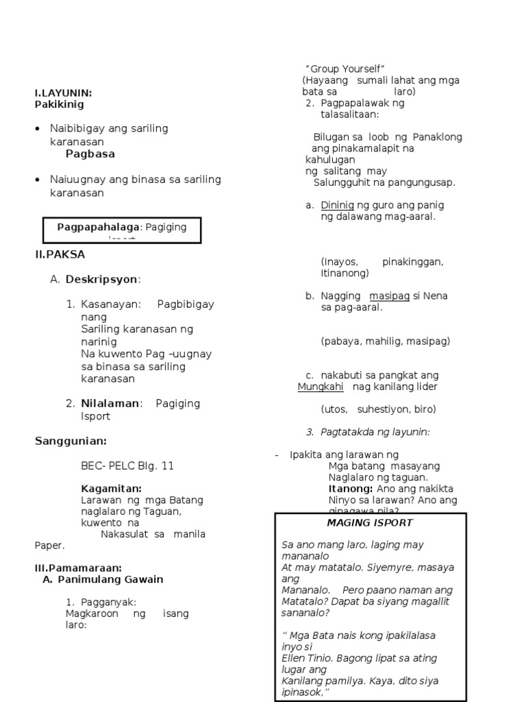 Nagagamit ang pangngalan sa pagsasalaysay tungkol sa tao bagay sa paligid 1 1 1 9 Nagagamit ang salitang pamalit sa ngalan ng tao sa usapan at sitwasyon 1 1 1 10 KAMALAYANG PONOLOHIYA Natutukoy ang mga salitang magkakatugma 1 1 1 11 Natutukoy ang mga salitang magkakatugma 1 1 1 12 Napapalitan at nadaragdagan ang mga pantig upang makabuo ng mga bagong salita Pag-Unawa sa BInasa Nasasagot ang. Naiuugnay ang sariling karanasan sa. View lesson plan sa Filipinodocx from DEPARTMENT 11 at University of Notre Dame.