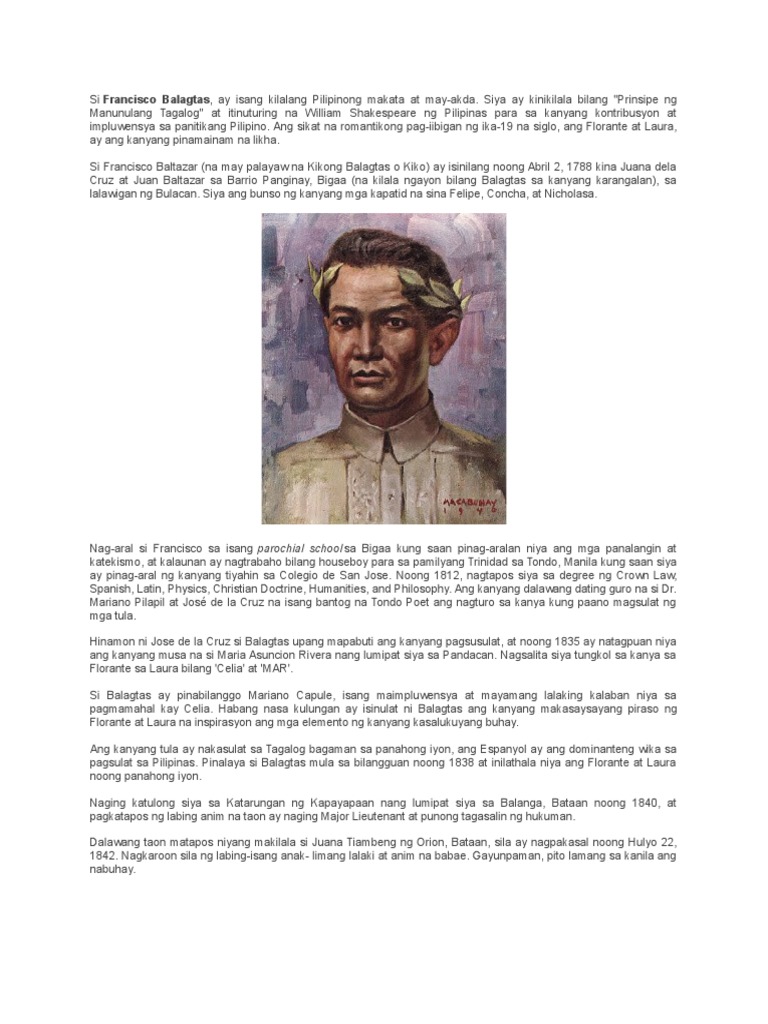 IPanimula Talambuhay ng Manunulat Si Francisco Balagtas ay isang kilalang Pilipinong makata at may-akda. 2018-01-16 At muli nga niyang ipinagpatuloy ang pagsulat ng mga komedya awit at mga korido siya ay namayapa noong Pebrero 201862 sa gulang na 74. Ilahad ang mga dahilan ni Balagtas upang sumulat ng Florante at Laura.
